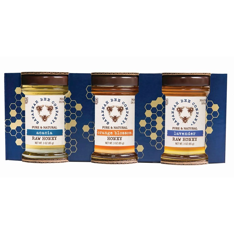 Includes 3 oz honey samples of Acacia Honey, Orange Blossom Honey, and Lavender Honey. Acacia Honey: With vanilla notes and a luminous pale hue, our premium Raw Acacia Honey touches the palate with delicate perfection. Known for its distinct clarity and resistance to crystallization, this single-varietal gem comes from honey harvested from the forests of black locust trees that grow from Northern Italy to Ukraine. Orange Blossom: Bright and sweet as just-picked fruit, our Orange Blossom Honey brings a juicy citrus aroma to drinks and foods, especially baked goods. The bees visit the vast blooming orange groves of central Florida to bring you this sunshine in a jar!Lavender Honey: The bees love lavender’s fragrant purple blooms, giving this popular honey varietal the taste and aroma of a summer mountain meadow. Sourced from the wild along the verdant hills between Spain and Portugal, our Lavender Honey provides a mild sweetness and distinct floral notes.