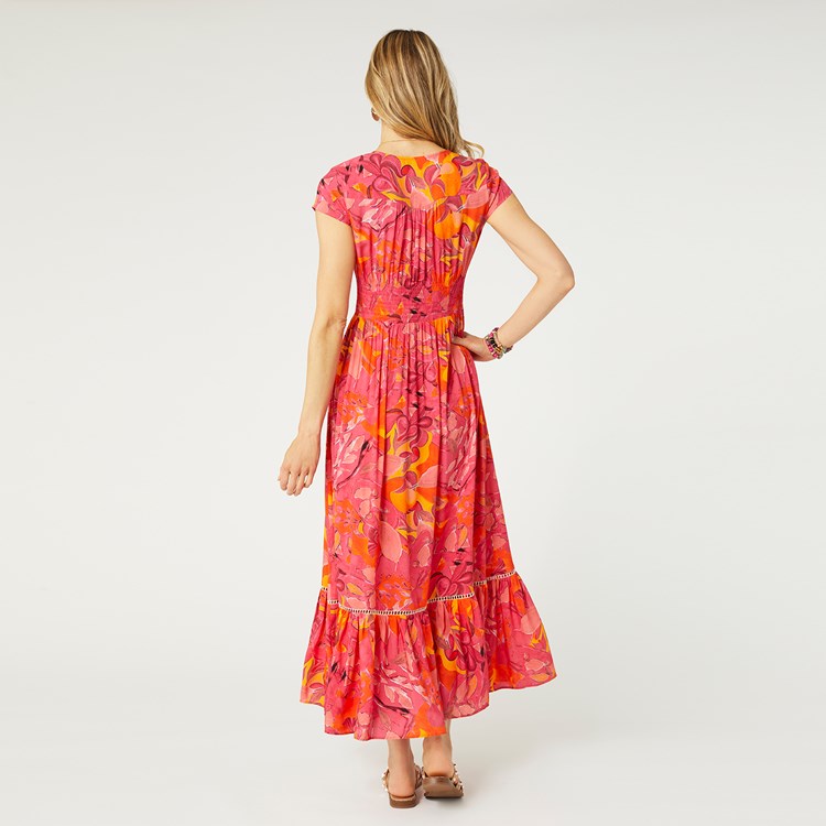 Description: Get ready to turn heads with our Aliya Button Front Maxi Dress! Bursting with color and featuring a flattering v-neckline and cap sleeves, this dress combines style and comfort effortlessly. The functional mother of pearl buttons down the front and smocking detail around the bottom add a touch of elegance. Perfect for any occasion, this dress is a must-have addition to your wardrobe!
