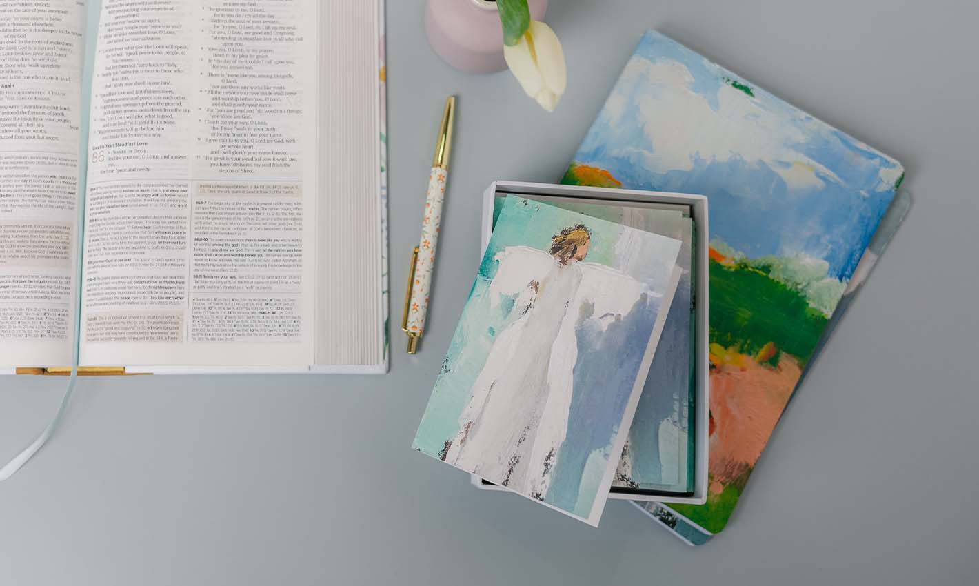 This is a big reason why we are starting to build out our collections. Our Hopeful Collection, designed around a praying Angel with vibrant colors of blue, orange, yellow and pink, evokes the feeling of hope and its message can be found across multiple products – from scripture cards with different verses displaying hope in the Bible, to notecards where you can write well wishes, to acrylic trays designed to illuminate your home. Showcasing a complete set can help amplify the beauty of the artwork, and encourages customers to collect them all.
