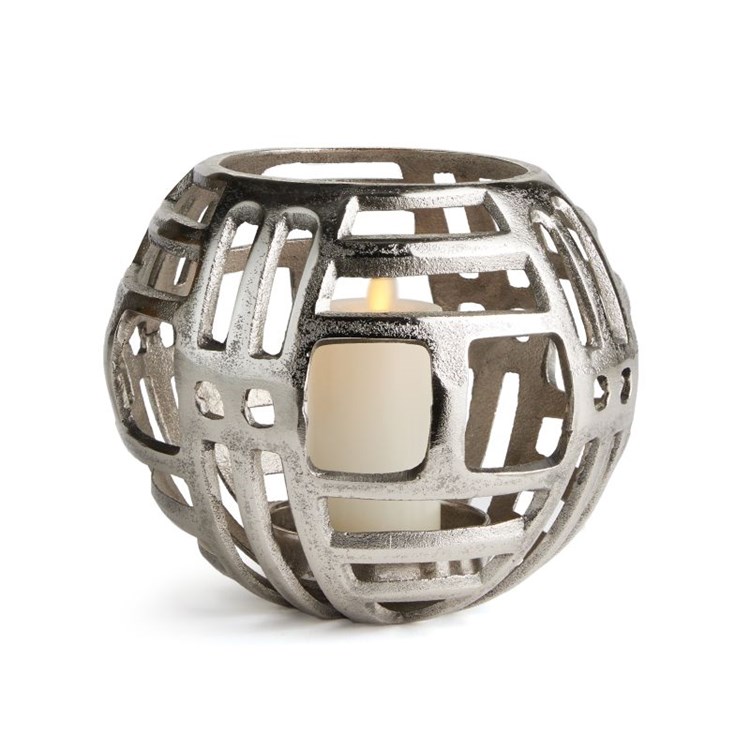 Made of sturdy cast aluminum, this rounded hurricane features alternating horizontal and vertical linear cut outs for a modern touch. The antique silver finish adds a touch of elegance to any space. Perfect for use on a console or side table, this hurricane is designed for interior use and can be easily cleaned with a damp cloth. Remember to never leave a burning candle unattended and only use LED flameless candles when specified. Candle not included.