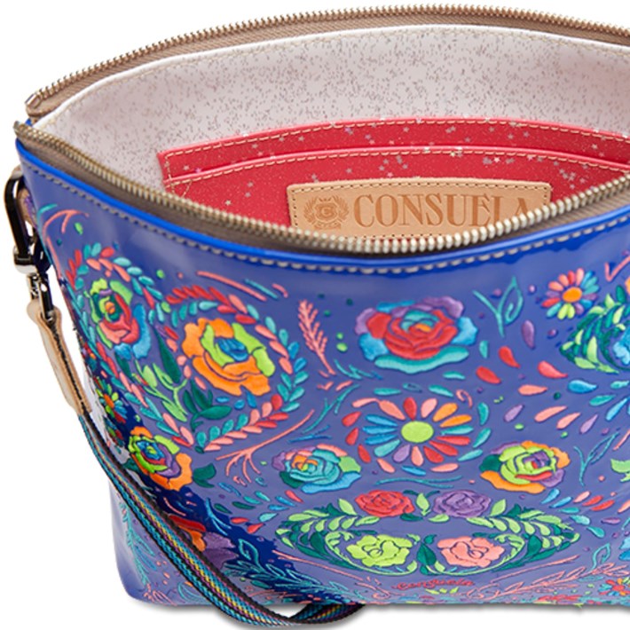 The Downtown Crossbody bag is not only stylish with its embroidered design, but also practical with its adjustable strap and two interior pockets. Its roomy open interior allows you to carry all your essentials and more, making it the perfect accessory for a day out. Whether you're running errands or exploring the city, this crossbody bag is ready to accompany you on all your adventures.