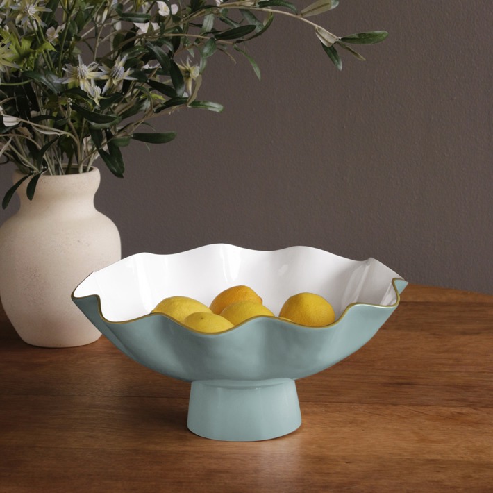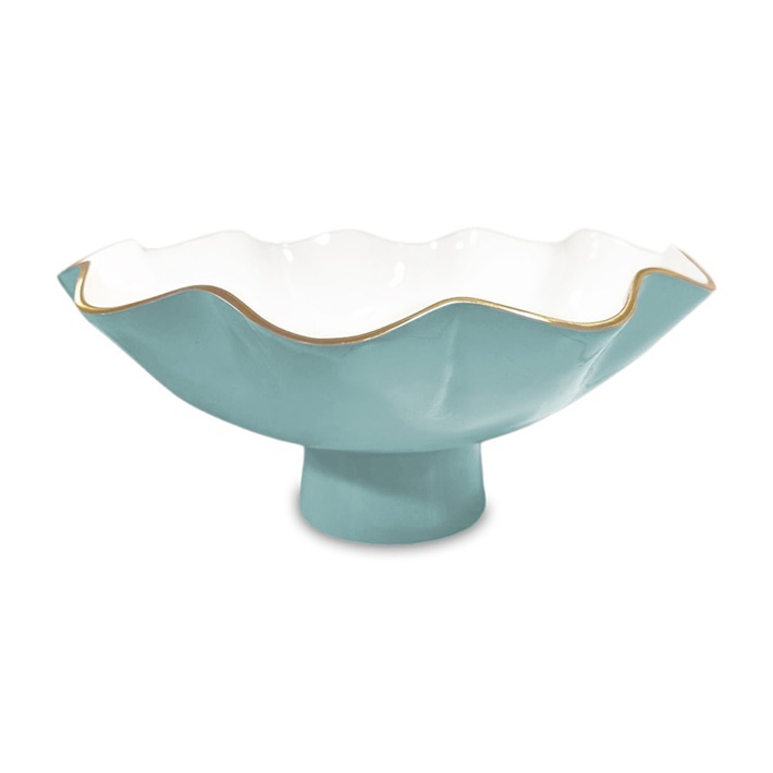 Elevate your style! Beatriz Ball continues to innovate and add new finishes and techniques to its handmade offerings with the multicolored ENCANTO Collection--incorporating vibrant enameled colors and gold-tone details on bowls, trays, platters, ice buckets and picture frames. Your table will be the canvas, and your paint palette pieces of delightful colors! Next level design. Notable for its gently curving sides, elegant rise, and brilliant two-tone finish rimmed in gold, the ENCANTO Carola Large Pedestal (Turquoise and White) is a fabulous design that is as practical as it is decorative. Ideal for fruit, salads, snacks and sides, combine with other ENCANTO Carola pieces for an elevated serving set. The ENCANTO Collection pieces are all about classic shapes, re-invented in lively colors. Fashionably tailored in delightful colors, ENCANTO items are fabulous gift items for brides, and perfect for anyone who loves to entertain and decorate. On trend, their beautiful designs with curving forms add grace and sophistication to any setting. Makes an awesome centerpiece! Beatriz Ball’s intensely handmade products use eco-friendly and sustainable materials and are crafted by artisans who trace a heritage of metalworking for generations. Made of a top quality, easy-care, aluminum alloy with a food safe enamel finish. Dishwasher safe.