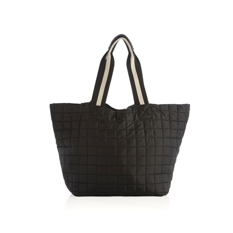 nylon; gold hardware; double handles; detachable, adjustable cross-body strap; top zip closure; 1 outer trolley sleeve, 2 outer zip pockets, 1 inner zip pocket, 2 inner slip pockets