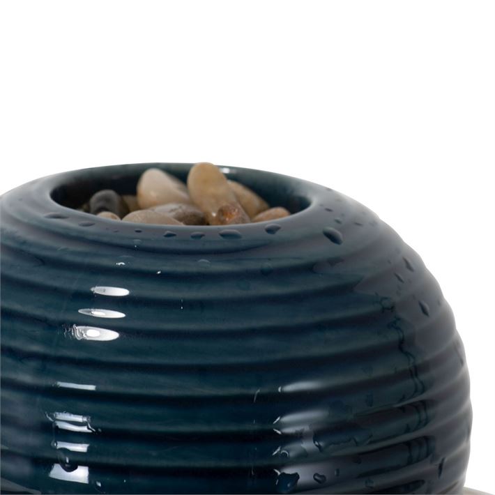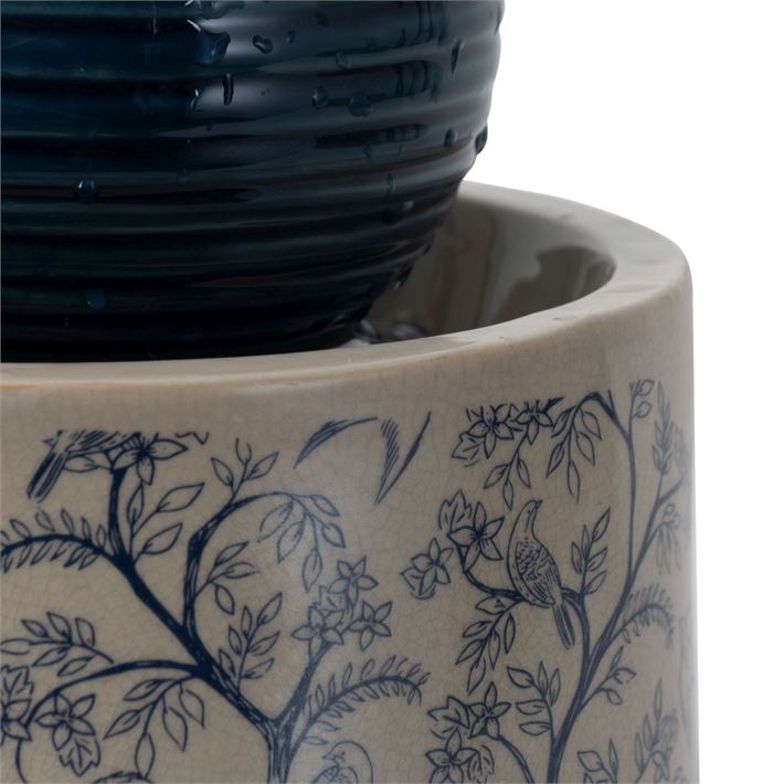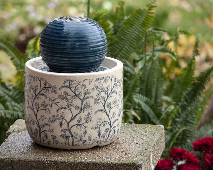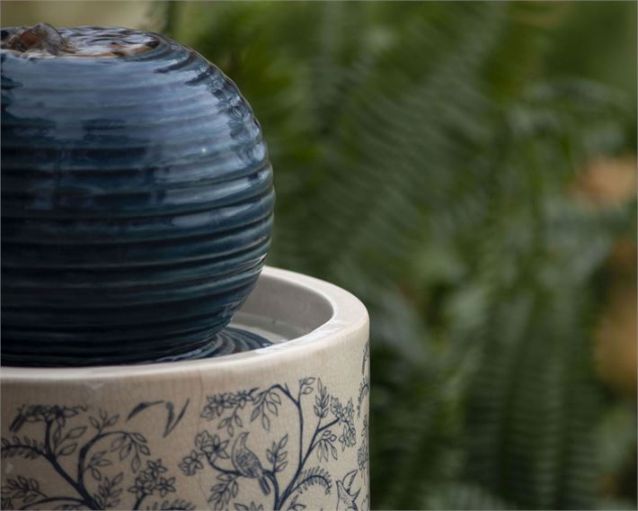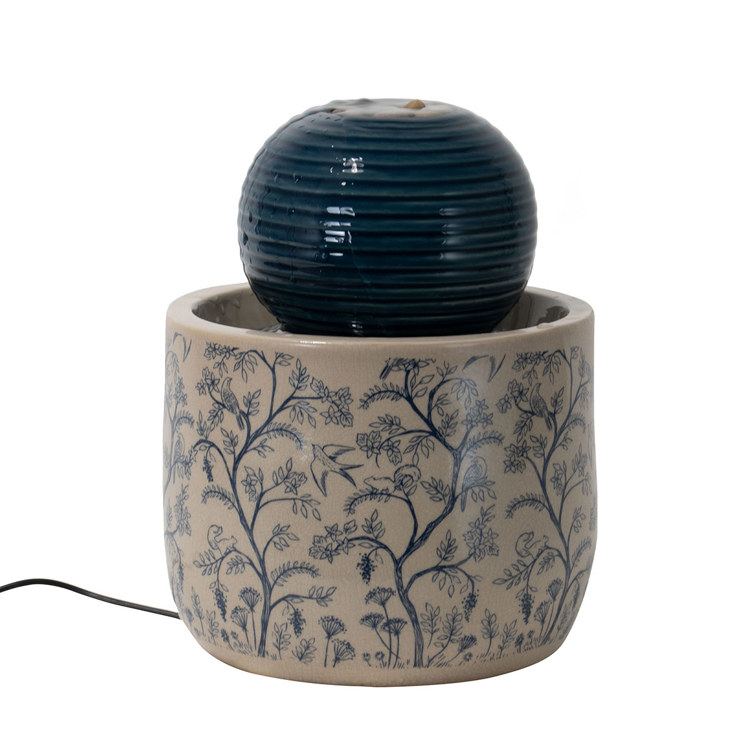 The Georgie Chinoiserie Fountain is a stunning piece that combines traditional design with a timeless blue and white color palette. Made of ceramic, the fountain features a white crackle glaze base with intricate blue chinoiserie patterning. The textural orb on top is finished with a deep blue wash glaze, creating a soothing ambience as the water bubbles over and trickles down the ribbed structure. This fountain is a beautiful addition to any outdoor space, adding a touch of elegance and charm.