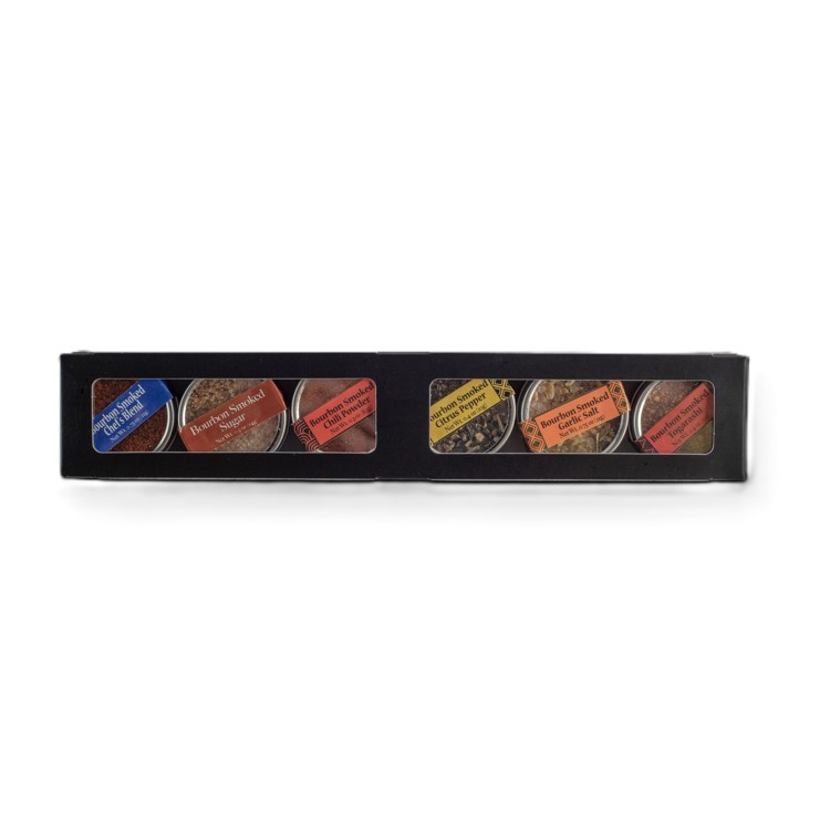 Description: We handpick and locally source gourmet spices, then smoke them low and slow with bourbon barrel staves. The Miniature Trial Gift Set is a great way to experience the Bourbon Barrel Foods Bourbon Smoked Spice Blend collection. Find out which blend you love the most with this convenient assortment. The set of six includes Bourbon Smoked Chili Powder, Bourbon Smoked Citrus Pepper, Bourbon Smoked Garlic Salt, Bourbon Smoked Togarashi, Bourbon Smoked Sugar and Bourbon Smoked Chefs Blend.