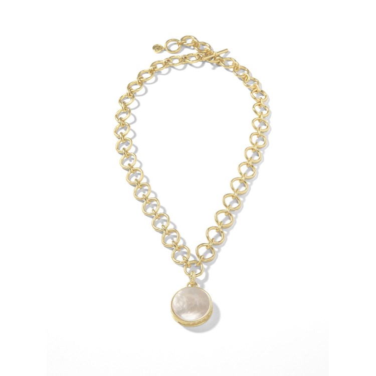 Named after a mermaid in long-lost folklore, Naia means to flow, which perfectly suits this mother-of-pearl collection. The thickset shimmering droplets pay homage to the powerful, swirling curves of a mermaid's tail, with a ring of mermaid scales on each piece. The 18 KT Matte Gold Plated jewelry features an adjustable toggle closure and is adorned with semi-precious Mother of Pearl. This elegant piece has a length of 20 inches and is sure to add a touch of enchantment to any outfit. Style #288483.
