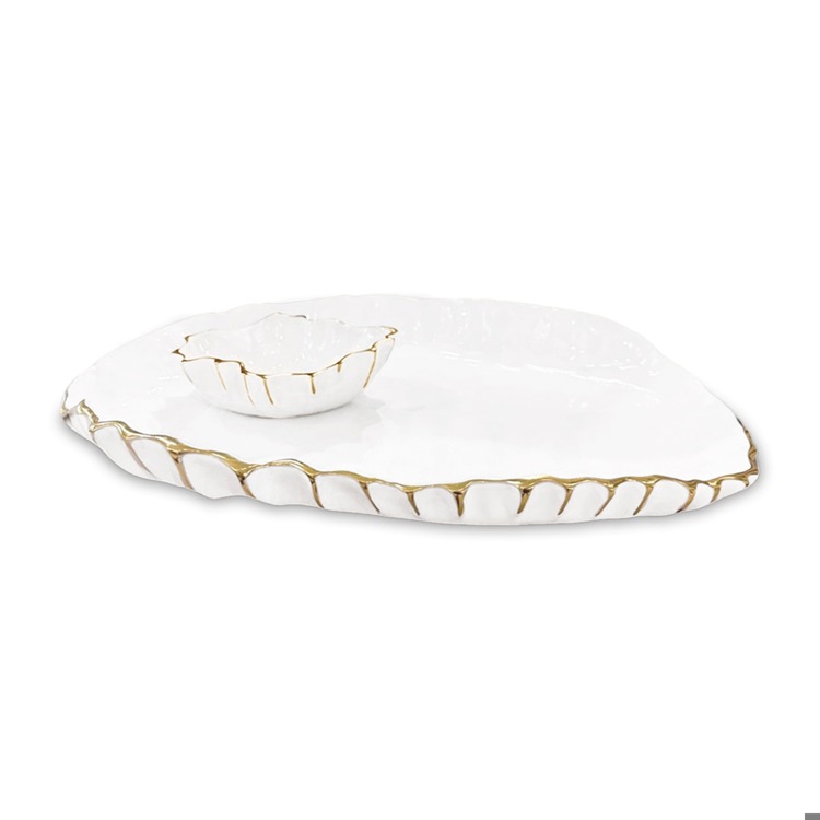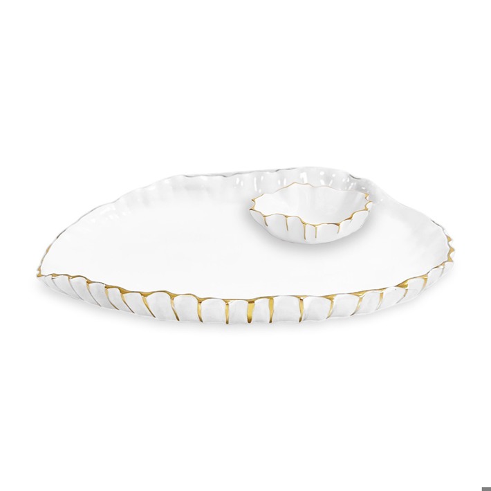 Description: Two pieces in one! Beatriz Ball continues her collaboration with Louisiana-based ceramicist Gretchen Murchison with the vibrant THANNI Mystic Collection. Inspired by natural forms, the THANNI Mystic Large Oval Platter with Mini Bowl (White and Gold) is rippling, flowing and organic. The dynamic two-piece design features a generous oval platter and a versatile small bowl, each with a serving area of white enamel that’s trimmed in a brilliant gold tone, creating a serving piece that combines beauty, artistry and functionality. This stylish piece is party ready, and is ideal for serving chips or veggies with dip. Fabulous gift item for brides, and perfect for anyone who loves to entertain or decorate. Totally on trend. Beatriz Ball’s intensely handmade products use eco-friendly and sustainable materials and are crafted by artisans who trace a heritage of metalworking for generations. Made of a top quality, easy-care, aluminum alloy with a food safe enamel finish. Dishwasher safe.