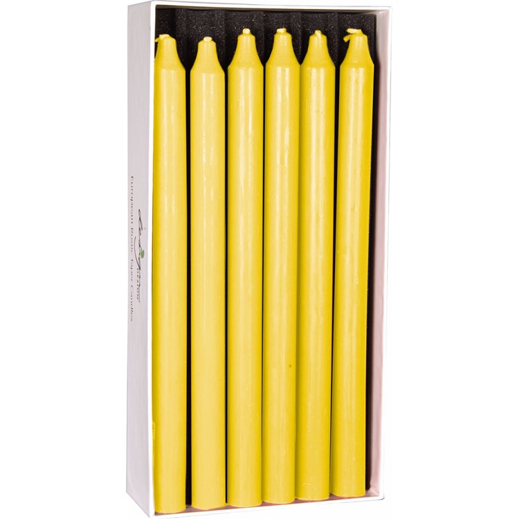 Description: Add a touch of European charm to your home decor with these rustic taper candles. Made from high-quality materials, these candles are designed to bring elegance and style to any room. The colorful twist on the classic design adds a playful element, making them perfect for special occasions or everyday use. Each candle features a unique, imperfect design that adds character and texture. With a burn time of approximately 10-12 hours, these candles are sure to create a warm and inviting atmosphere in your home. This pack of twelve comes in a convenient peggable acetate box, making them easy to store and display.